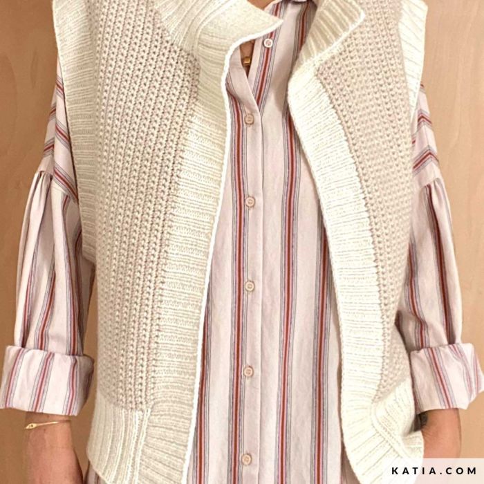Enjoy crocheting the Colete vest with Cotton-Merino Concept by Katia thanks to this pattern available from size S to XL. Colete is the perfect vest that everyone dreams of owning! Its wide armholes, large knitted ribbing in a contrast color and relaxed style give it an elegant and cozy look reminiscent of sheepskin vests.