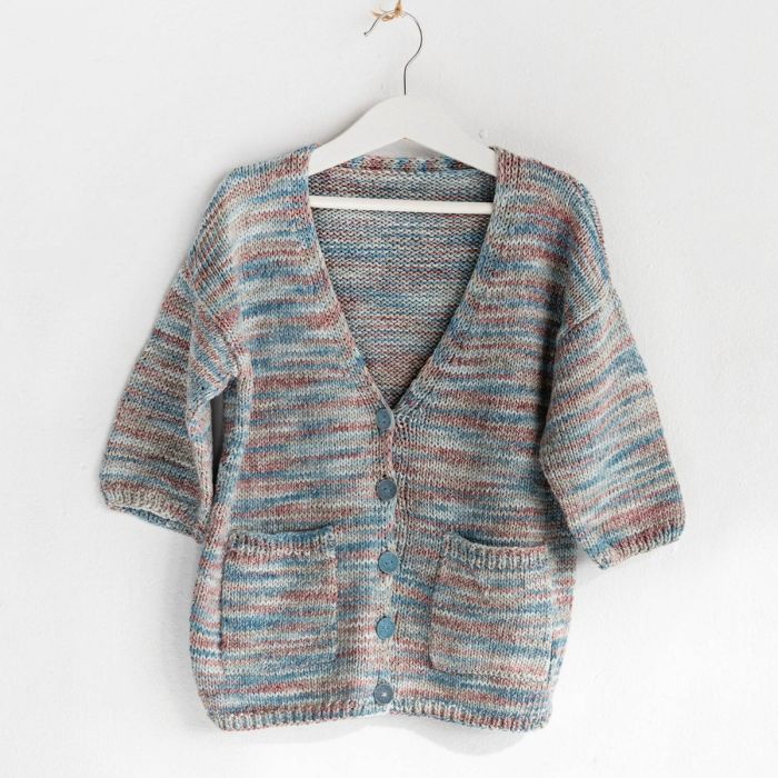 A multicolour knit cardigan with half sleeves and front button fasteningn knitted using Veganette. This yarn is 100% VEGAN! This is a cotton yarn that is soft and spongy just like wool. It is specially designed for vegan knitters.