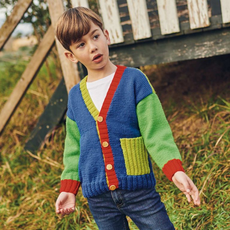 Basic Merino primary colorblock cardigan pattern Get inspired by this modern two-toned sweater for kids. The textured stitch design, knitted with Essential Alpaca by Concept by Katia, an exceptionally soft alpaca yarn, provides your little one with the comfort and versatility they need for their daily looks. The 1x1 ribbed finishes make it the perfect garment for any occasion!