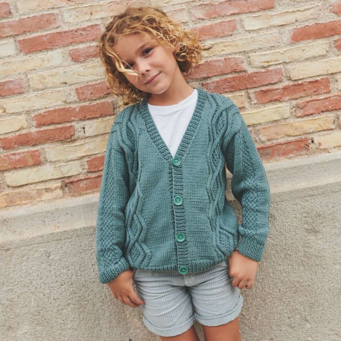 SeaCell Cotton cabled V-neck cardigan pattern A charming V-neck cardigan fastened with 4 buttons. Designed with Irish cables, textured vertical stripes on the sleeves, and 2x2 rib finishes. This cardigan, knit with SeaCell Cotton yarn, is perfect to keep your little one warm and comfortable.