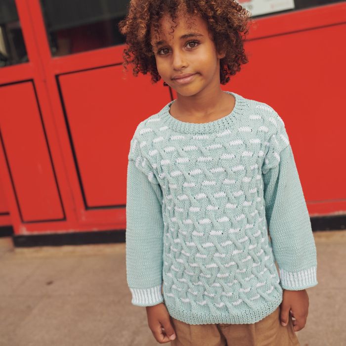 Cotton 100% children’s cabled sweater knitting pattern This cute children’s cabled sweater is perfect for your little one to wear on cooler days! Knit with Cotton 100% yarn, enjoy knitting this interesting two-toned motif combining stripes and cables. The colorwork ribbed cuffs in blue and white are the main feature of the plain stockinette stitch sleeves. Pattern available for sizes 4 to 12 years.
