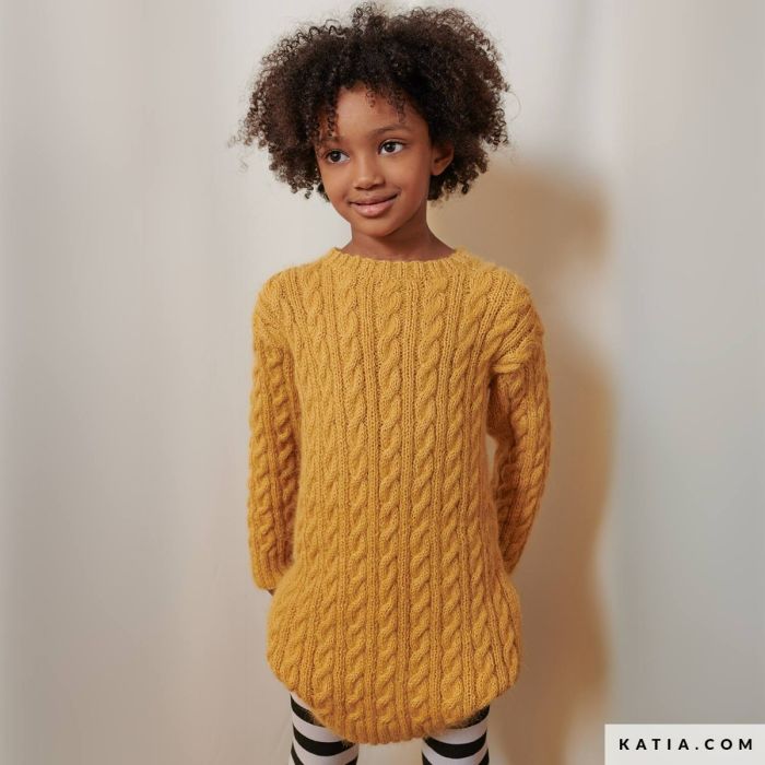 With this knitting pattern, you can knit a comfortable long-sleeve children’s dress in a fun Soft Gratté colour. You can definitely play with the length of the garment and knit a classic round neck sweater with vertical cables. Enjoy creating an adorable garment with instructions for sizes 2 to 10 years of age!