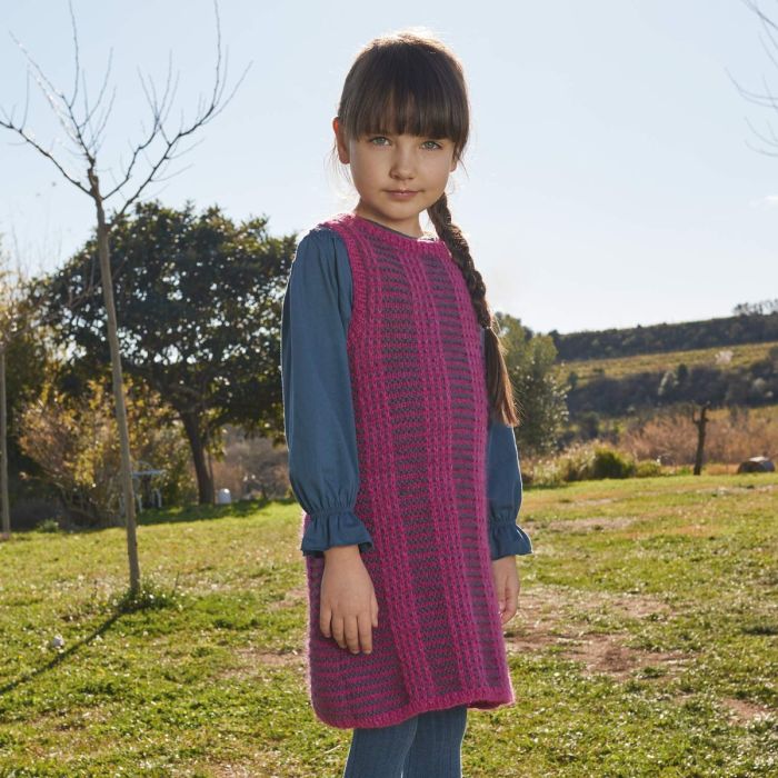Add a warm and stylish piece to your child’s wardrobe with this sleeveless dress knitted using the brushed-effect yarn Katia Soft Gratté. The two-toned fantasy stitch creates a beautiful play of vertical and horizontal stripes. Comfortable and warm, this design is available in sizes 2 to 10 years. Knit an original soft garment for cold winter days.