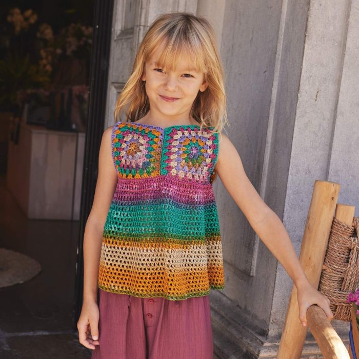 Create this charming summer top for kids using Katia Fair Cotton Granny, a multicolor yarn ideal for crocheting granny squares without the hassle of weaving in too many ends. The beautiful color gradient on the body complements the classic granny squares, making this design cool and comfortable for sunny days. Enjoy every stitch as you create something unique and colorful for your child.
