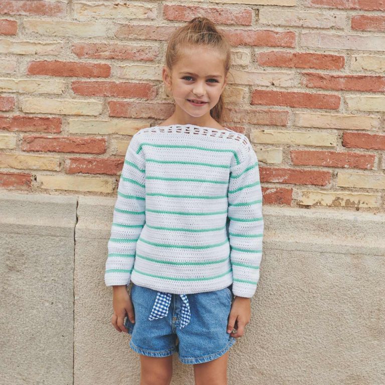Missouri lace bateau neckline sweater crochet pattern There's nothing more comforting than this striped sweater for cooler spring and summer days! Crocheted in single crochet stitches with a lace bateau neckline, this Missouri sweater is the perfect piece for those who love children’s fashion.