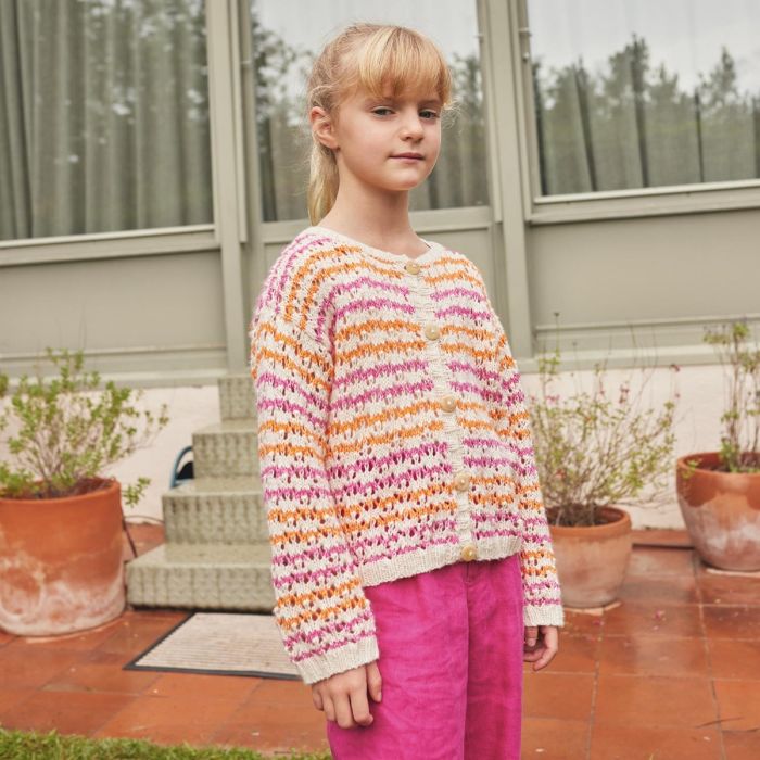 Add color and style to your child’s wardrobe with this striped cardigan, knitted in a simple lace stitch. Made with Puro Cotone by Concept by Katia, a soft and breathable cotton, it’s perfect for any season. Enjoy the satisfaction of creating something unique with your own hands.
