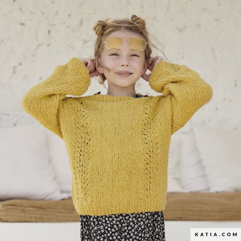 For the youngest members of the family, we suggest knitting a straight sweater in a fun and playful Pluma color. This kids’ sweater, decorated with two lace panels on the sides, is ideal to wear with dresses and skirts.