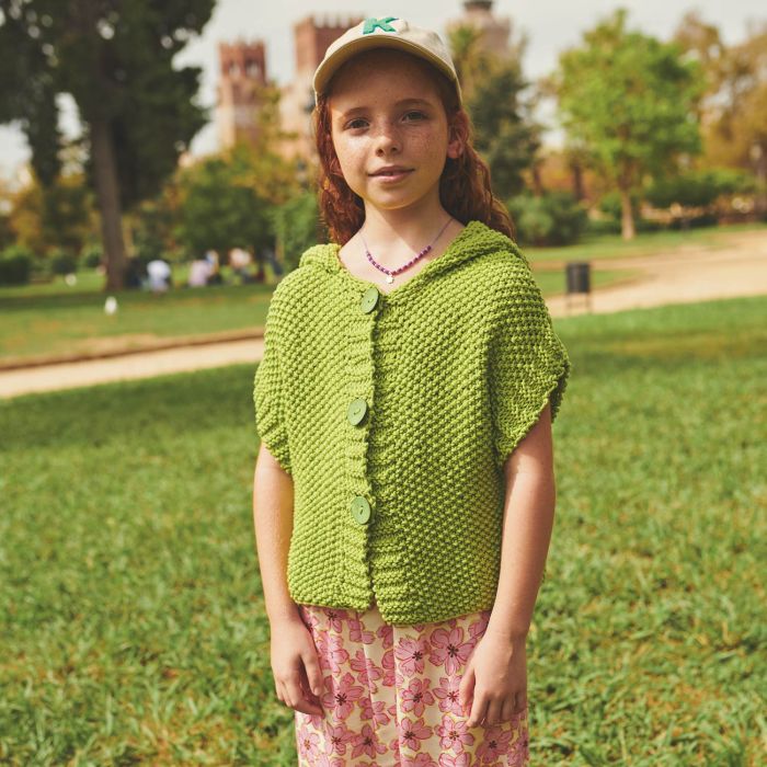 Easy Knit Cotton sleeveless hooded cardigan kit This wide sleeveless hooded cardigan is perfect for little ones to feel comfortable and fashionable. This cardigan is knit in moss stitch using Easy Knit Cotton for a soft but resistant result. It’s fastened with 3 large buttons, giving the garment a modern and fun vibe. kit available for sizes 4 to 12 years of age. Learn to knit this unique garment so that the youngest members of the family are always on trend!