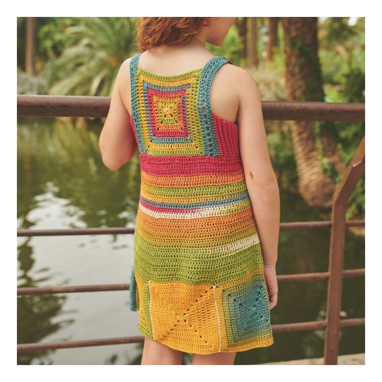 Fair Cotton Granny square children’s dress crochet pattern Have fun making this cheerful crochet dress for your little one! It’s made using Fair Cotton Granny, a special multicolor yarn to make granny squares, which gives it a fun and unique look. Combine basic crochet stitches with granny squares to create a fashionable strappy dress. Additionally, the crochet rib stitch at the armholes makes it comfortable to wear.