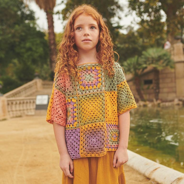 Fair Cotton Granny square children’s T-shirt pattern The perfect summer staple! This cute short-sleeved children’s tee is crocheted with Fair Cotton Granny yarn, with a colorful design creating different granny squares. The crochet granny squares are joined together with a plain color to create a unique and modern garment without ribbed finishes.