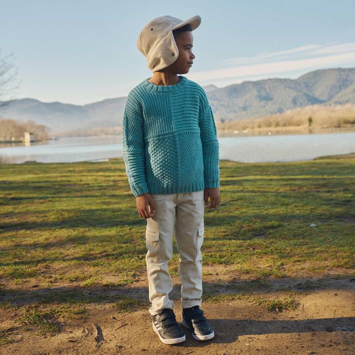 Merino 100% easy children’s sweater knitting kit A children’s sweater kit with easy stitches knit in Merino 100%, perfect for beginners. Every part of the sweater is ideal to practice different stitches. The 2x2 rib neckline, cuffs, and hem give it a professional finish.