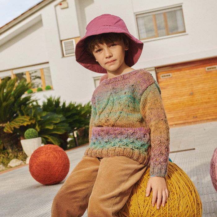 Azteca Tweed cabled sweater kit Do you want to knit an original sweater in sizes 4, 6, and 8 years? Knit a Celtic cable design with multicolor Azteca Tweed, with the base of the body and sleeves in honeycomb stitch, and a cabled center diamond on the front.