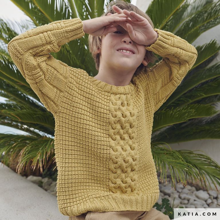 If you like textured stitch patterns, you might be interested in this knitted sweater. Play with different textured stitch patterns and add a vertical cabled pattern to the center of the body, both on the front and the back. The instructions for this textured sweater are available in children’s sizes 4 to 12 years.