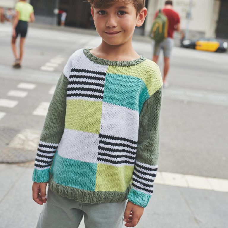 Alabama children’s colorblock and striped sweater pattern A fun children’s sweater handknit with Alabama yarn. A modern and very stylish garment, perfect for your little one to wear on any occasion. The front is knit using intarsia in a colorful geometric colorblock design, while the back is pistachio green. The cuffs feature white and black stripes. A unique and original sweater that will make your child feel special!