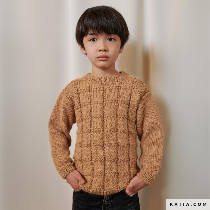 Adorable classic textures! You just need a soft yarn like Essential Alpaca in a tan colour to knit this charming children’s pullover with textured checks. The sleeves are worked in stockinette stitch while the round neck and cuffs are worked in 1x1 rib. The pattern includes sizes 2 to 10 years of age, and is available as a downloadable PDF.