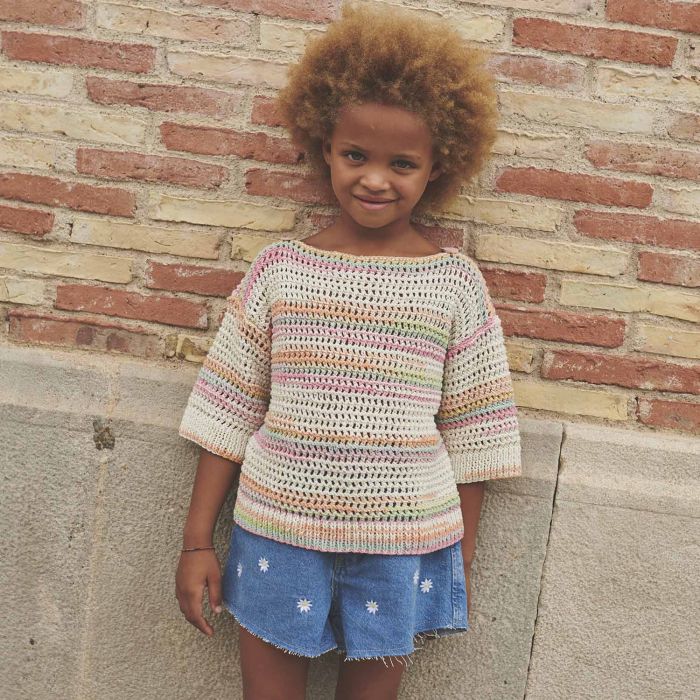 Alabama Flash free children's sweater crochet pattern Crochet a fun and comfortable children's sweater using Alabama Flash yarn! Follow this free pattern, suitable for beginners, to make this summer sweater with French sleeves. Its bateau neckline is decorated with two buttons, adding a touch of elegance to this charming design!