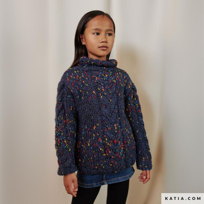 Try different yarns to achieve different designs. Knit this children’s jumper for sizes 4 to 12 years of age with Azulejo and make a garment with an original mottled pattern. The center cable motif and the high neck give this design a special twist.