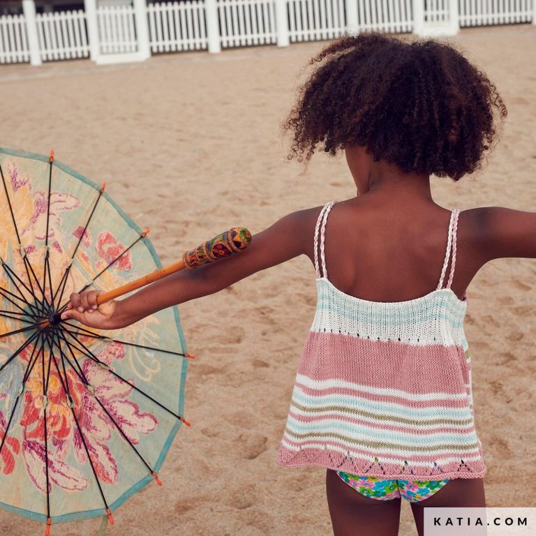 This summer, we suggest knitting a children’s top for sizes 2 to 8 years with an extremely interesting design. Combine a stripe of 2x2 rib, to adjust the fit of the top to the body, with stockinette stitch, to add positive ease and, finally, knit a simple lace motif for the border. Complete this striped top, a summery pattern created directly by knitting with Fair Cotton Mariner, with some thin double straps.