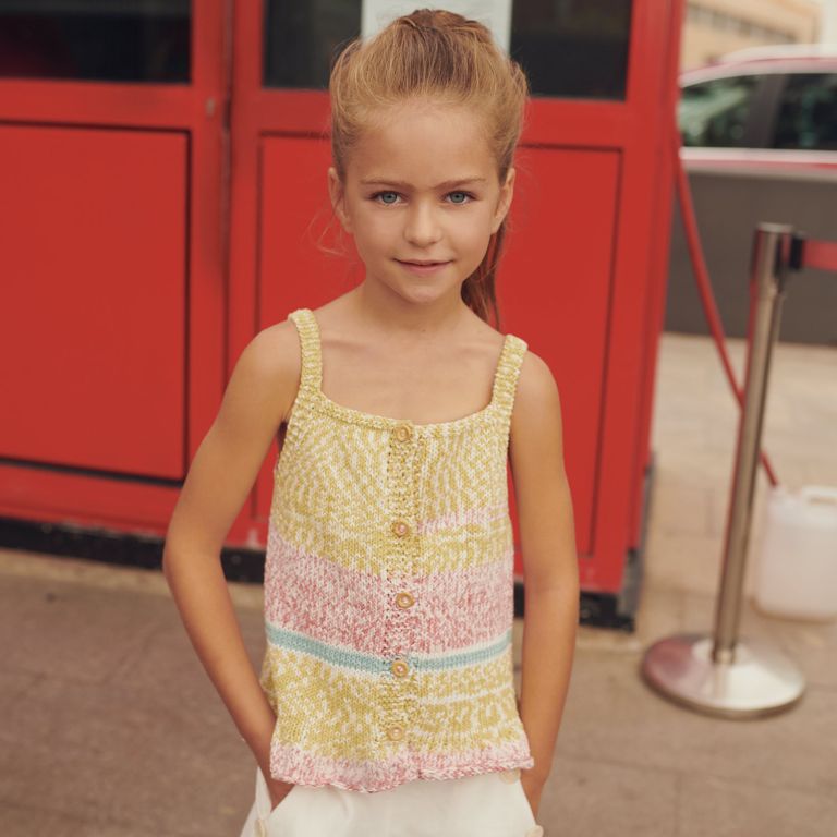 Mediterranea children’s strappy top knitting pattern Knit a children’s strappy top with soft Mediterranea yarn, a colorwork-effect print yarn. This pattern suggests knitting the front and the back at the same time. The edges and straps are knit in garter stitch, as well as the front closure fastened with 5 buttons. Surprise your little on with this cute top knitting pattern!