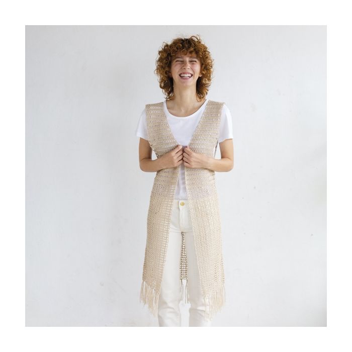 Learn how to crochet a long vest with fringe designed exclusively by @ahuyamacrochet for Katia. La Cala Boho Fringe Vest kit made in 4 sizes with Lino 100%.