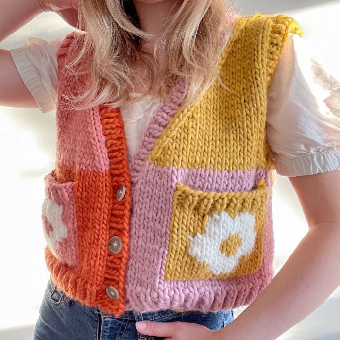 This vest pattern is a fun, oversized and chunky knit. The pattern can be worked up in about a week and is written for advanced beginner level knitter. The vest is knit up in 3 panels and is made up of two front panels and one back panel. They are then seamed together and completed with a neckline and armhole bands that are knit along the edge of the vest. The pattern includes sizes XS to 3XL and the sample is knit in size M.