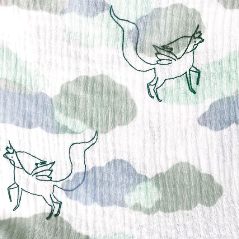 A cloud and unicorn print on a white background. Double layer fabric with a very soft and pleasant handle. Use it to sew babies clothing and accessories. 100% cotton fabric.