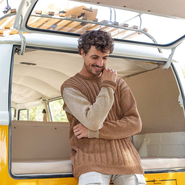Lino 100% men’s contrast-sleeve sweater pattern Look incredible in this two-toned sweater in Lino 100%! Its round neckline and ribbed fabric are the perfect combination to achieve a modern bold look. It’s topped off with a distinguishing teardrop detail on the back. Follow this pattern to create your own sweater with a contrasting sleeve!