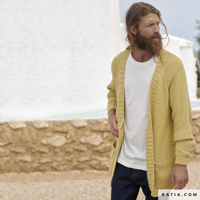 Relax with the simplicity of double moss stitch while you knit this men’s cardigan with raglan sleeves and decorative patch pockets. Find the instructions to knit this modern jacket with Linum in the All Seasons 3 magazine. Enjoy this garment suitable for any occasion!