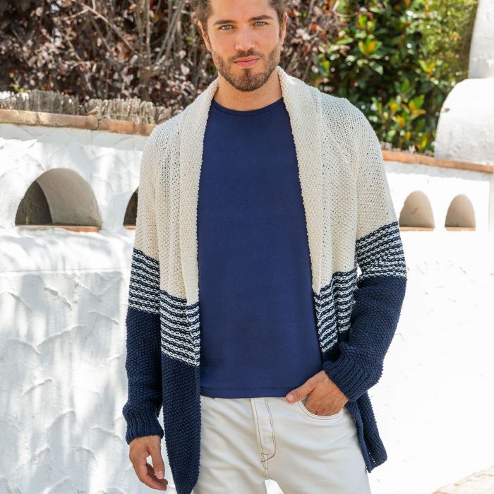 Men's jacket with reverse collar in moss stitch, ideal for beginner knitters. Using Alabama yarn and 4mm needles, this jacket is light and perfect for Summer.