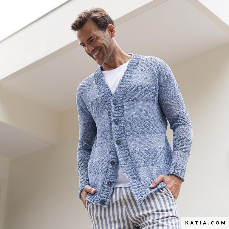 Lino 100% men’s cardigan with textured stripes An elegant men’s cardigan knit with Lino 100% combining stripes made with stockinette stitch and textured stitch. A simple straight cardigan design with large button bands and 6 buttons. It may seem like a classic garment, but with the right outfit, it can give a modern vibe to any day-to-day look.