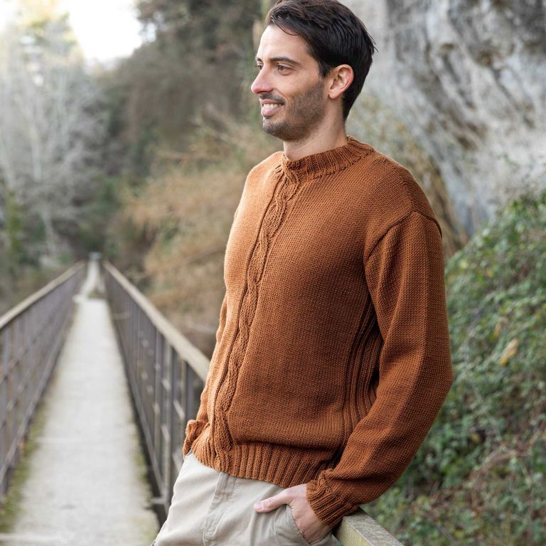 Merino 100% men’s center cable sweater pattern Combine style and comfort in this men’s hand-knitted round-neck sweater featuring ribbed side embellishments and a large central cable. Made with Katia Merino 100%, an extrafine yarn for enjoying nature in comfort and your own personal style, thanks to the wide range of available colors.