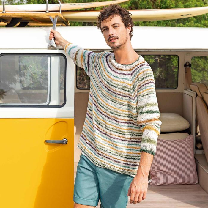 Paraiso multicolor stripe men’s top-down sweater pattern There’s nothing better than knitting a striped sweater to wear on a relaxing summer’s day! This top-down circular sweater knit with Paraiso is the perfect piece to complete your summer look with. Enjoy knitting a unique multicolor stripe print in stockinette stitch: with thin stripes on the body and wider stripes on the sleeves. Enjoy your holidays in style!