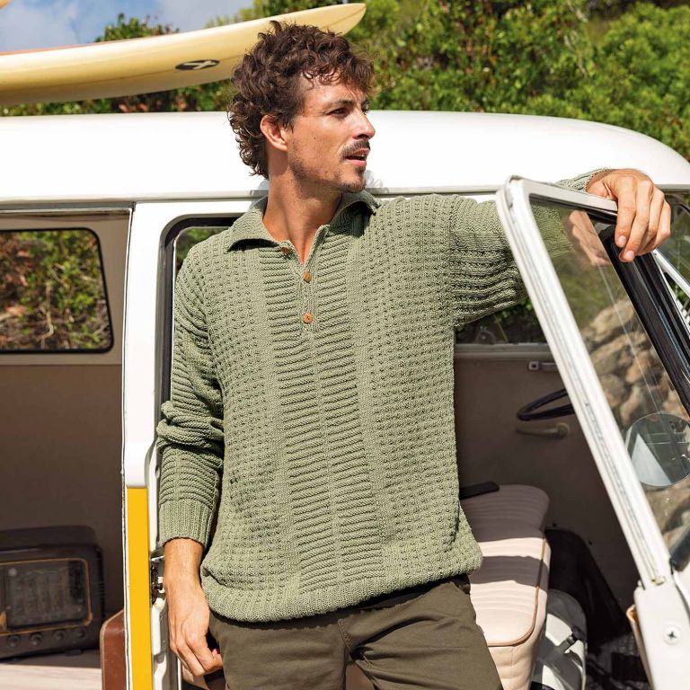 Missouri men’s polo neck sweater knitting pattern Add a retro vibe to your looks with this classic men’s knit sweater with a polo neckline! Knit with a textured stitch using Missouri yarn, this sweater is perfect to wear with your favorite khakis. Fastened with 3 buttons, this classic piece is a wardrobe staple. Add it to your handknit collection!