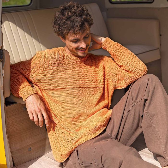 Fair Cotton men's ribbed sleeve and yoke sweater kit Add a modern touch to your look with this great men's sweater! Knit with Fair Cotton, an organic cotton that is soft to the touch, this peach toned sweater with a round neckline and yoke is perfect for experienced knitters. The ribbed sleeves add personality! Follow the kit to knit a flattering garment for stylish strong men.