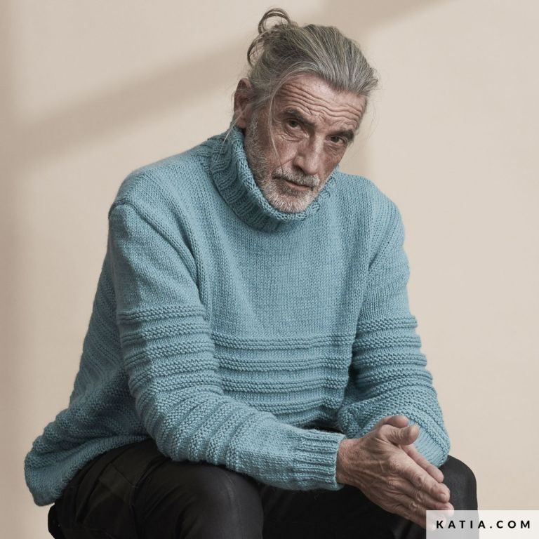 Choose between the colours of Essential Alpaca or go with this blue-gray colour to knit a double neck men’s jumper. A youthful jumper with a fun striped texture. You just need to knit in garter stripes in some sections and make the body and sleeves coincide. Perfect for intermediate knitters.