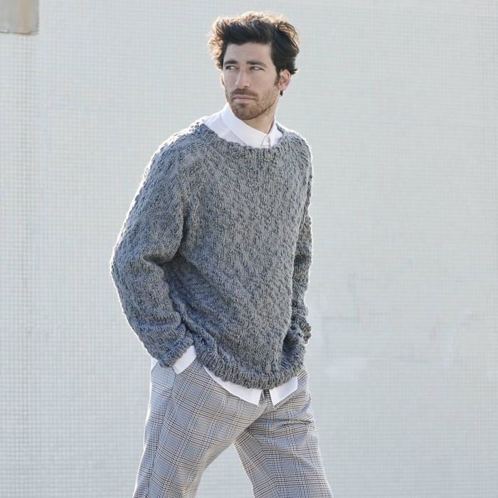 Cotton-Merino Volume men’s sweater pattern knit in the round A bottom-up sweater pattern knit in the round with raglan sleeves. This men’s sweater knit with Cotton-Merino Volume is a modern and timeless piece perfect for any occasion.