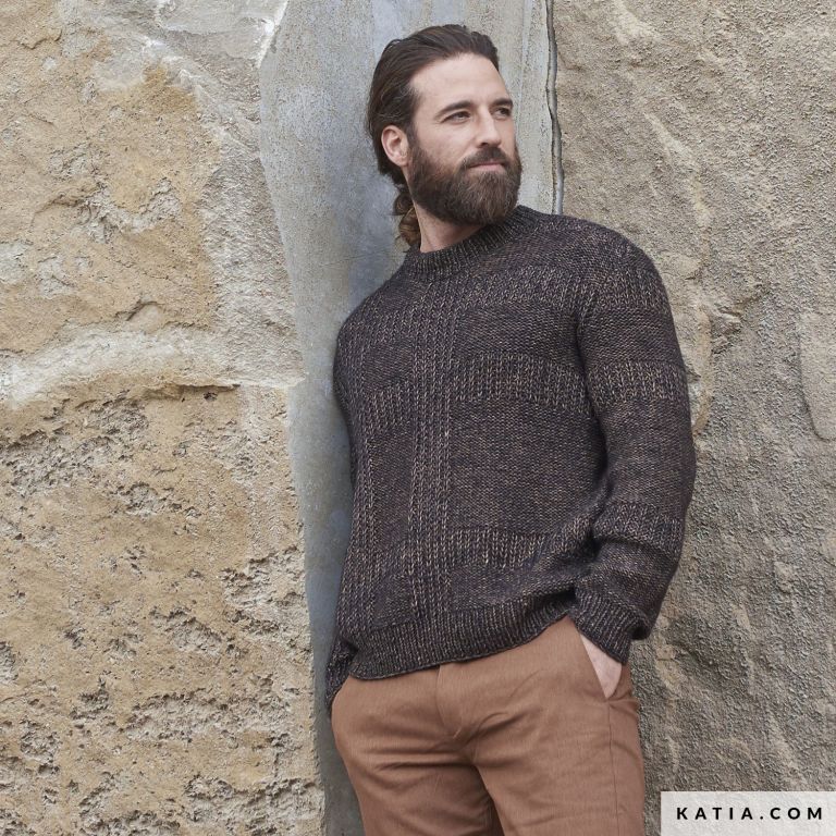 Man's jumper knitted on straight needles in reverse stockinette stitch with an eye catching design of vertical and horizontal stripes in mock fisherman's rib.