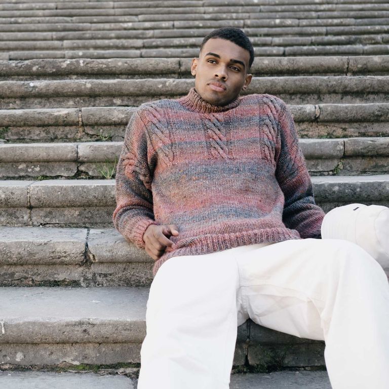 Azteca Tweed cabled men’s sweater pattern This men’s sweater is perfect for winter! A sweater pattern with details like its high neck, cabled yoke, and sleeves featuring the original tweed print in gradient colors of the Azteca Tweed yarn.