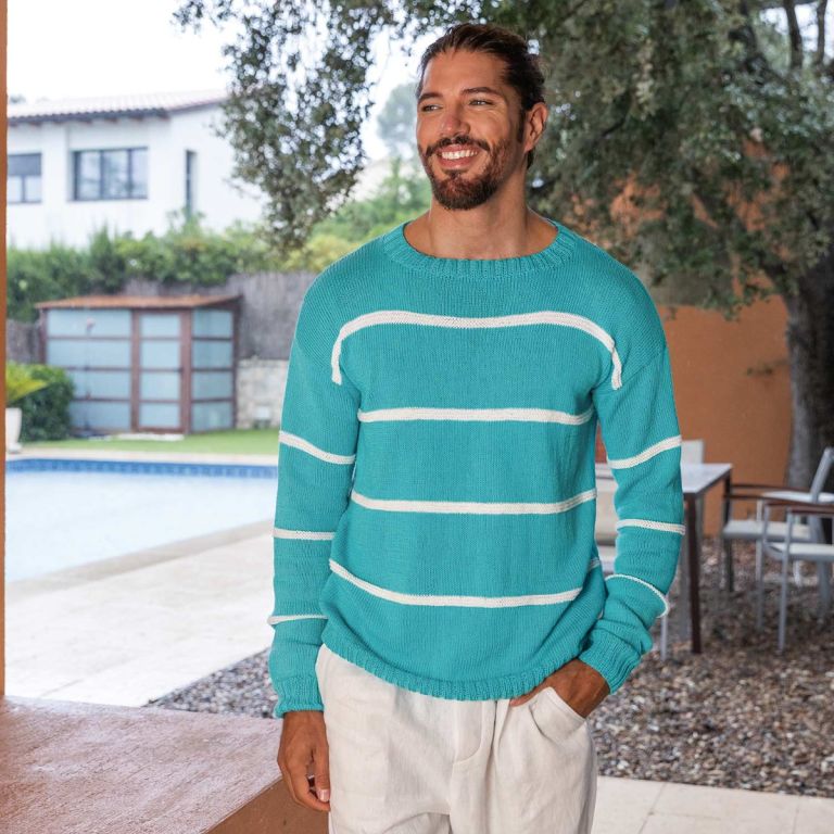 Discover this striped men’s sweater pattern in the Katia Casual 120 magazine. Knitted using Katia Fair Cotton, a soft and lightweight organic cotton yarn, its round neckline and long sleeves make it ideal for summer. Choose from the 42 colors of Katia Fair Cotton and create a one-of-a-kind garment with your own two hands.