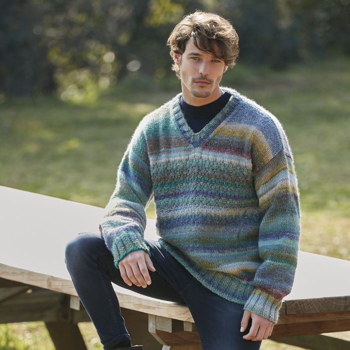 Long sleeve v-neck jumeper in an easy to knit stitch perfect for Winter. Using Azteca yarn, knit this mans jumper.