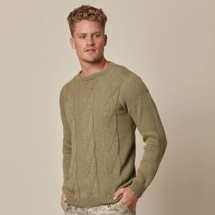 Man's long sleeve knitted jumper with a round neck and cable pattern. Available to create in sizes S - XL, using up to 14 balls of Katia Linen. Linen is a light fresh yarn perfect for Summer.