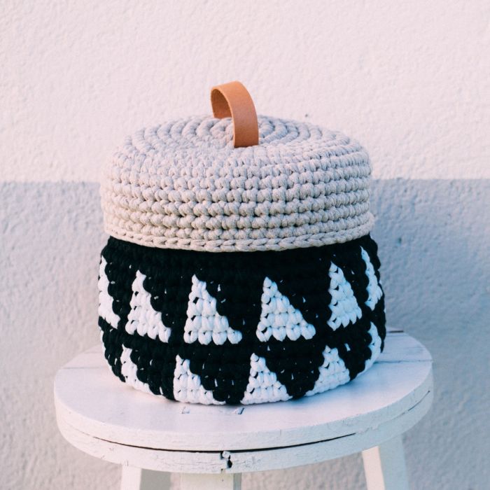 Work the basket in rounds with two-color tapestry technique in single crochet (sc) stitches. In two-color tapestry crochet always change the color of the yarn in the last yarn over of the stitch (st). Start from the bottom with white yarn, carry the black yarn inside the stitches from the round 10 on.