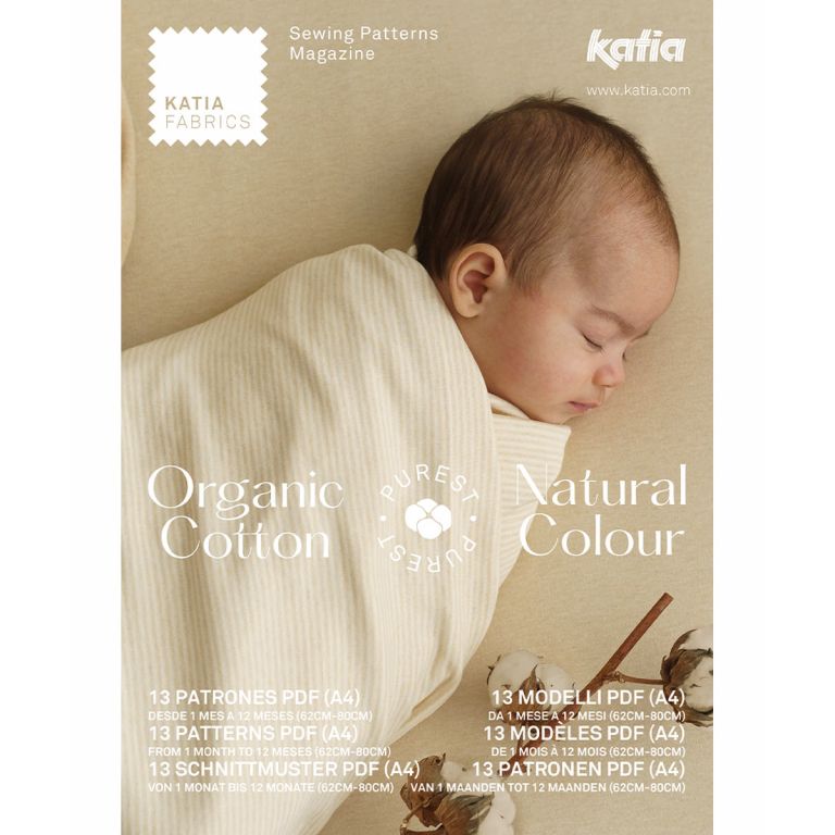 In this Purest eBook we have collated 13 PDF sewing patterns for babies from 1 to 12 months. These patterns are suitable for all sewing levels and include perfect templates for exploring and learning new sewing techniques. In this digital publication, available only at Katia, we have gathered together 13 models to sew with the new Purest fabric, a 100% cotton in a natural undyed colour. Discover this authentic wonder of nature; an organic, biodegradable, undyed and chemical-free fabric. Futhermore, it is hypoallergenic, making it suitable for the most sensitive baby skins. Get your scissors and sewing machine ready so you can enter the amazing world of sewing for newborns with the Purest Ebook from Katia Fabrics.