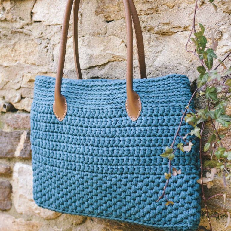 This rectangular bag pattern with handles made with Big Ribbon is perfect for carrying your tablet or laptop. Using Katia Big Ribbon will make it lightweight and durable, and it can be adapted to a wide range of colors so you can customize it as you wish. Start making yours right now!