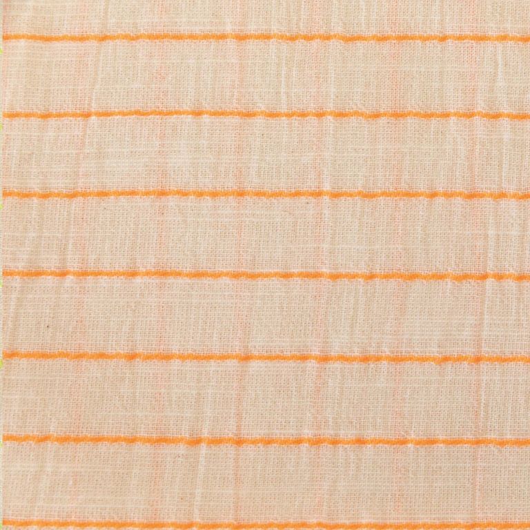 A soft, ecru cotton fabric with a natural appearance and subtle crumpled effect. A fluorescent orange thread running horizontally through the fabric gives it a unique summery contrast of colours. A cool, versatile fabric for making all kinds of garments and accessories.