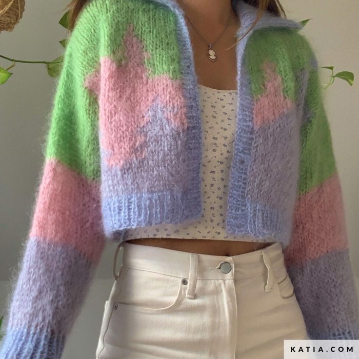 The feeling of waking up in the morning and going for a hike inspires The Explorer Cardigan. The Explorer Cardigan is a cropped colorwork knit with a boxy fit and a big statement collar. It is worked in Katia Ingenua, a fluffy mohair yarn, in four different colors. Choose your favorite color combination and enjoy this comprehensive Premium Designers pattern.