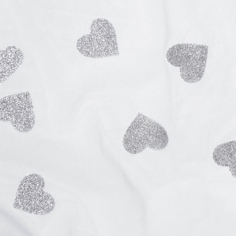 100% nylon tulle in white with a silver heart design. It's easy to sew costumes, skirts and small details that make all the difference with this fine and delicate tulle fabric.