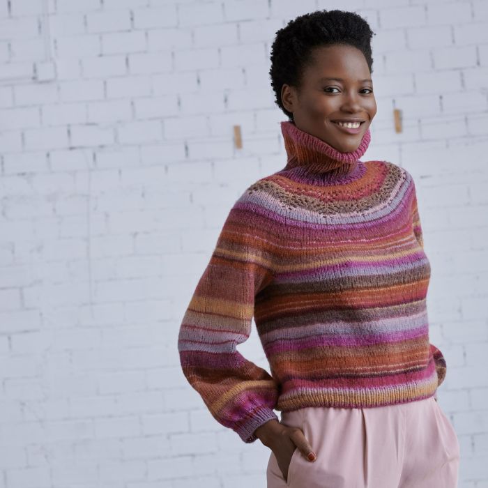 Discover this cropped top-down sweater knitted in the round with Angelo by Concept by Katia, a yarn that is not only lightweight but also very warm. This sweater, knitted in stockinette stitch, features an elegant lace yoke, a large turtleneck, and trendy puffed sleeves. Start knitting your cropped sweater today and make each of your winter outfits unique and original! Find the pattern and lace chart in the Concept Multicolor magazine.