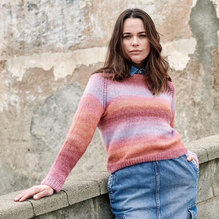 Angelo top-down cropped circular sweater pattern The Angelo circular top-down cropped sweater pattern by Concept by Katia is perfect for learning to knit in the round while creating a stylish basic garment. Its cheerful color combination ranging from burgundy and pink to mauve makes it the perfect companion for your favorite jeans. It is knitted with two skeins of Angelo yarn, which adds an angelic vibe. Discover this pattern and create your perfect outfit!