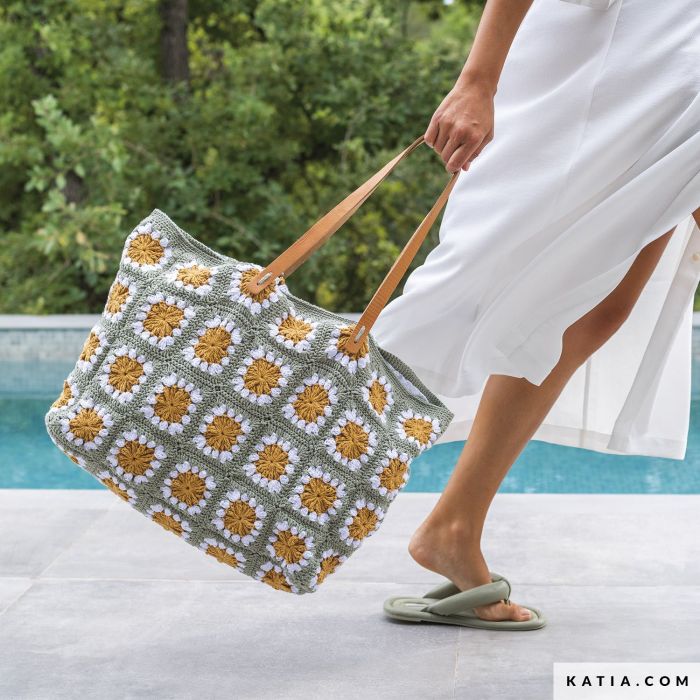 SeaCell Cotton daisy granny square oversized bag If you love large accessories and crochet, we recommend this oversized bag made with granny squares. Combine 3 colors of SeaCell Cotton to create crochet daisies: ochre, off-white, and khaki green. Without a doubt, a fashionable, useful bag that’s perfect to spend the day at the beach or the pool. We suggest finishing off the bag with short leather handles. If you want to give it a 100% professional look, we also recommend adding lining.